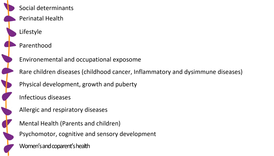 - Active collection of data and biological samples from parents and children (urine, hair, teeth, blood, umbilical cord blood, placenta, stool, etc.) during pregnancy and up to two years after birth, covering the “first 1,000 days”